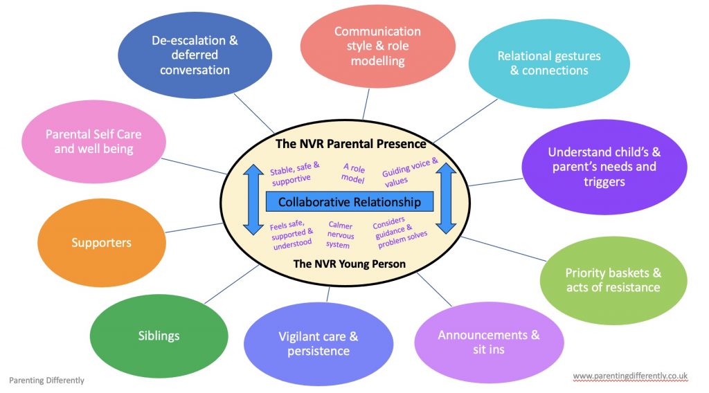 NVR is not about ‘fixing’ or controlling your child. It is about understanding and accepting your child for who they are, role modelling and guiding and prioritising the relationship with them. Collaboration not Control. This may initially mean lowering most demands until your relationship is stronger and only then start bringing in low demands. e.g. does it really matter if they don’t empty the dishwasher/wash up if you are not on talking terms or there is aggression?